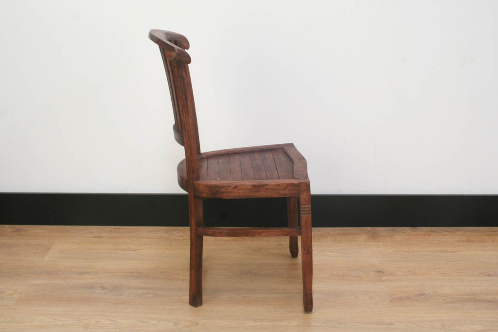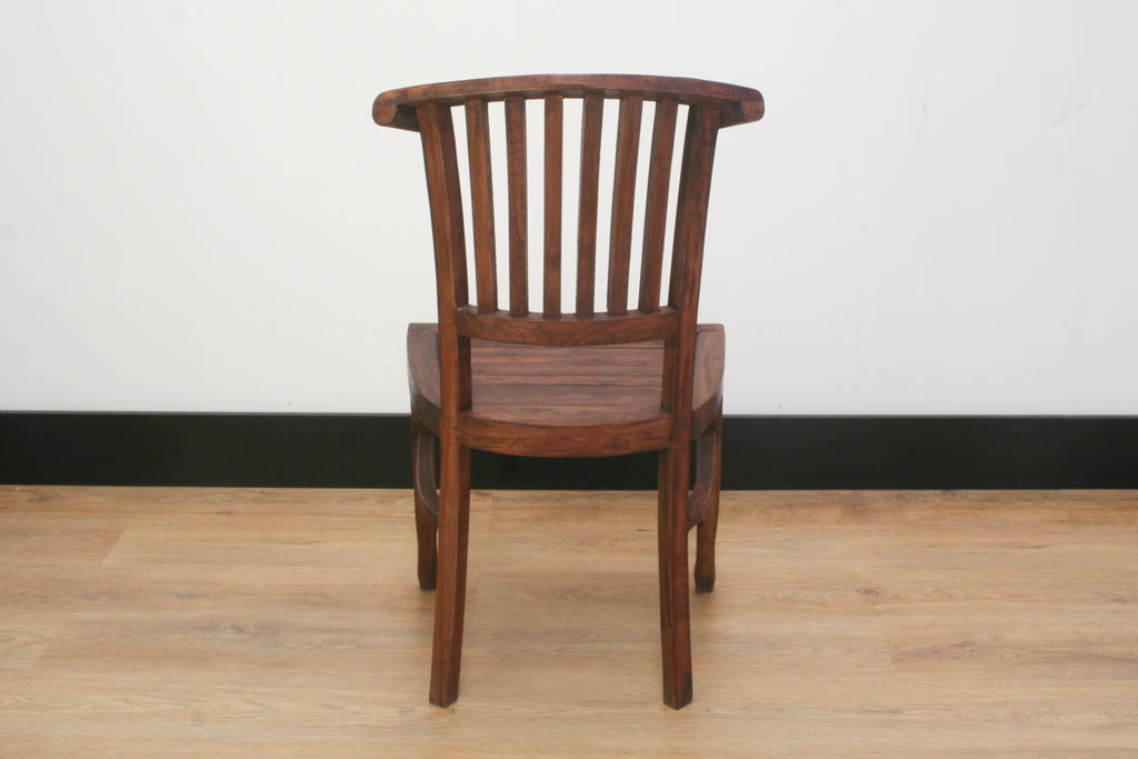 Silla de teca con líneas curvas y suaves. Las líneas no son rectas ni en el